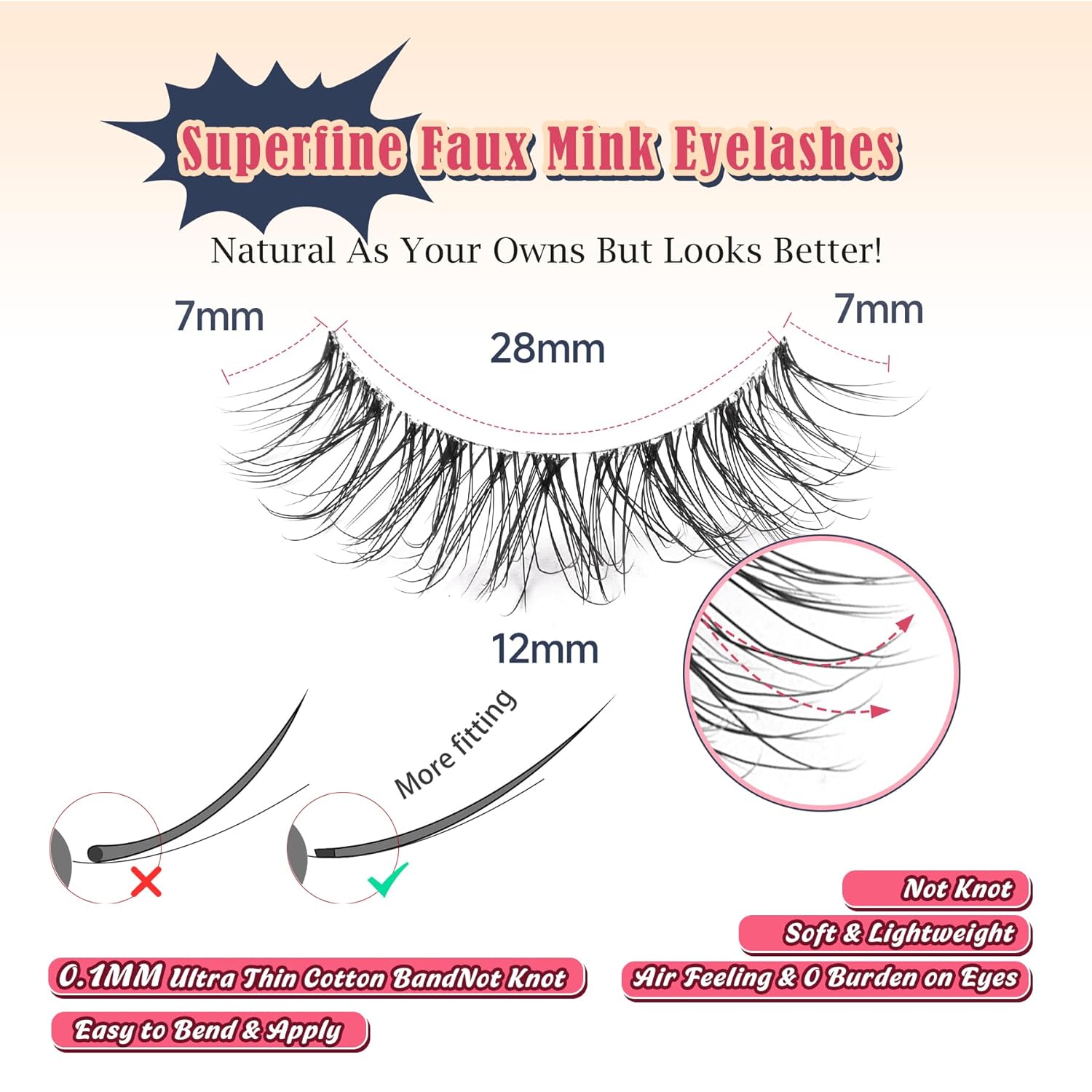 - 0.1MM THIN FLAT BAND: Our false eyelashes wispy use 0.1mm thin cotton flat band tech, seamlessly blend to your real eye lashes. Incredibly flexible, easy to bend and stay well on, beginner friendly
