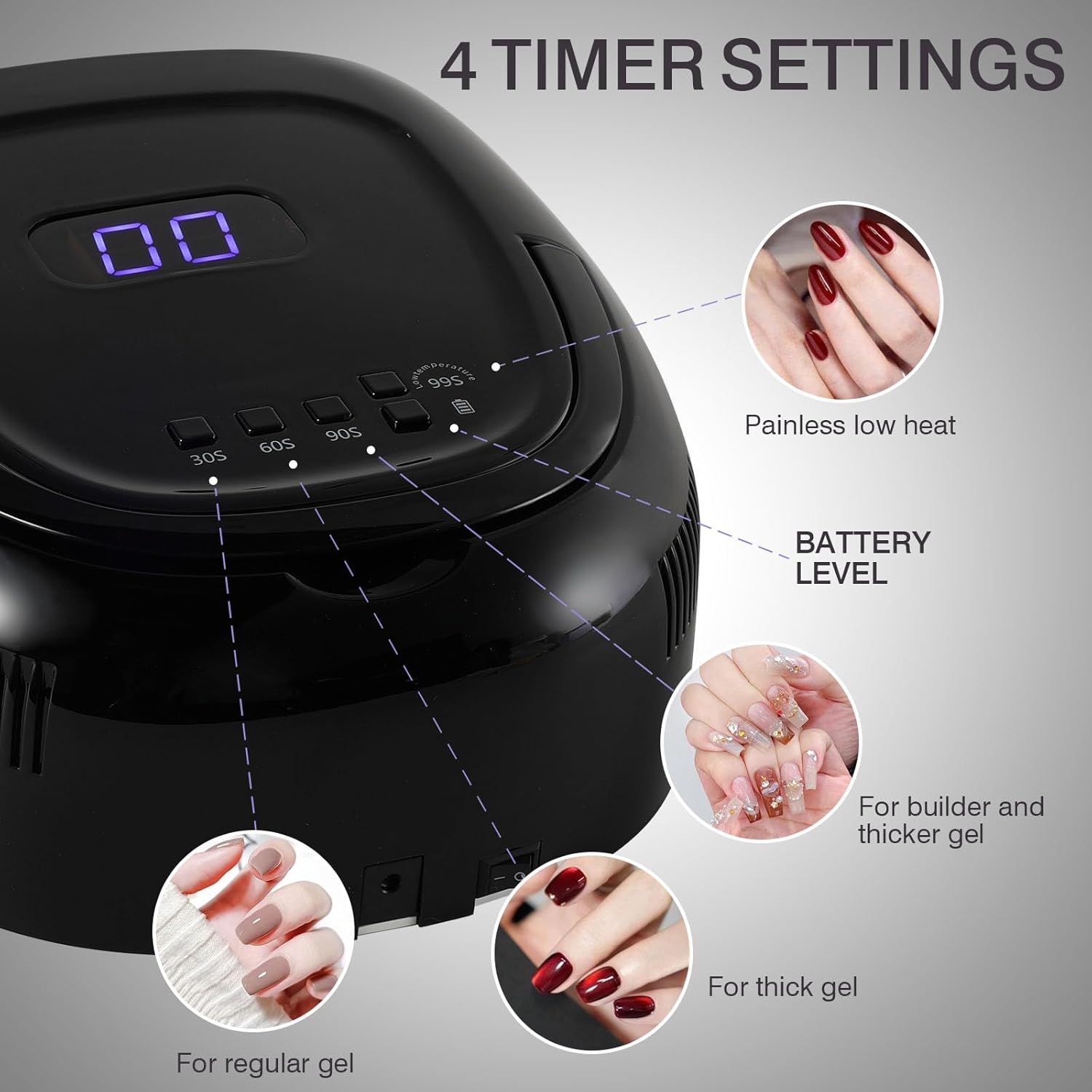 - Multifunctional Black Cordless Gel Nail Lamp: Choose from four timer modes (30s, 60s, 90s, 99s) to customize curing intensity; Optimized for both quick drying and gentle gel polish activation with temperature control