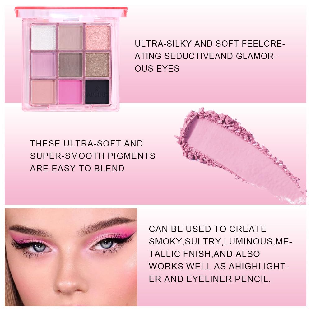 - 1. ๐จ 9 Stunning Eyeshadow Colors for Every Look Discover a versatile eyeshadow palette that includes White glitter, Nude matte, Pink glitter, Light purple matte, Brown matte, Gold glitter, Peach matte, Bright pink matte, and Black matte. These rich shades are perfect for creating everything from natural daytime eyeshadow to bold, glamorous looks.