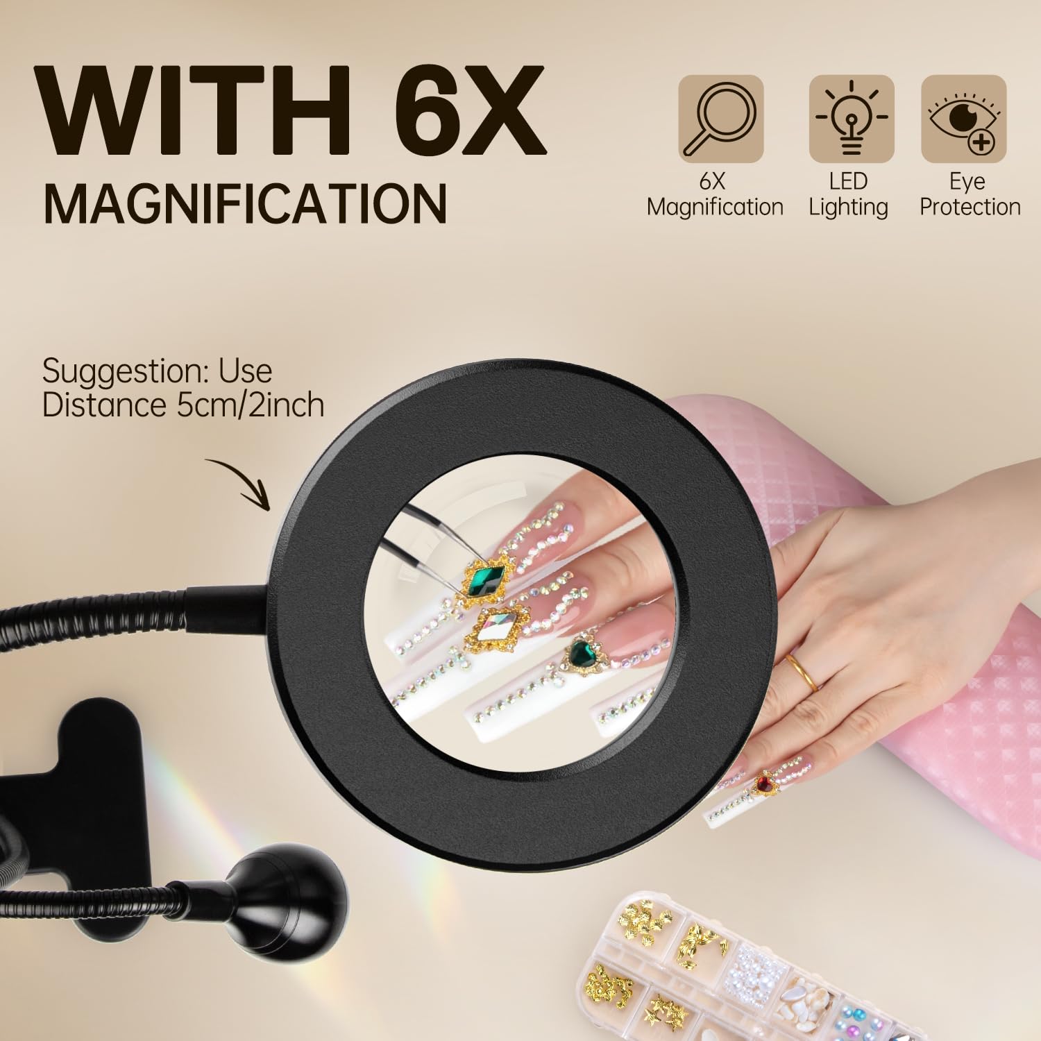 - 【Double Head Design】AORAEM uv lamp for nails uses a double head design with different functions. 6X magnifier white led light can be used for lighting, reading, complex nail tips art and jewelry restoration. Purple uv light can be used to dry all types of gel nail polish, etc.