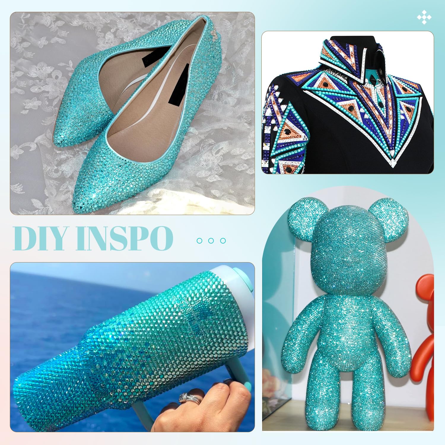 - WIDE APPLICATION -- These sparkling iridescent resin crystals are perfect for creating dazzling looks. Use them for bedazzling DIY crafts like shoes, tumblers, mugs, bottles, phone cases, popsockets, scrapbooks, photo frames, diamond paintings, greeting cards, bags, glasses, guitars, keychains, hats, masks, hair clips, bracelets, wristbands, clothing, wedding dresses, and more. Apply it to what you want to bling!