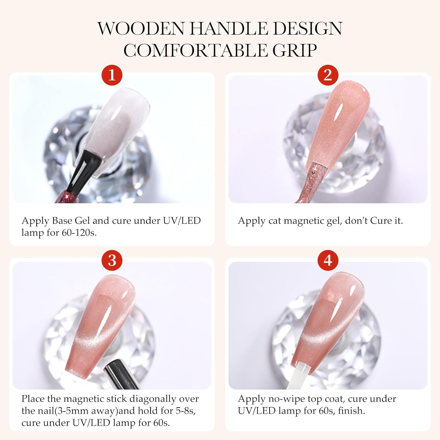 - HOW TO USE --- The magnet nail tool must be used with Cat Magnetic Eye Gel. Step 1: Apply Cat Magnetic Eye Gel Polish; Step 2: Place the magnet on your nails for 10-15 seconds to get a Cat Magnetic Eye effect (please keep the magnet side facing your nails, but do not touch the nail surface); Step 3: Immediately with U V light or LED light for 30-60 seconds; finally, apply a layer of topcoat
