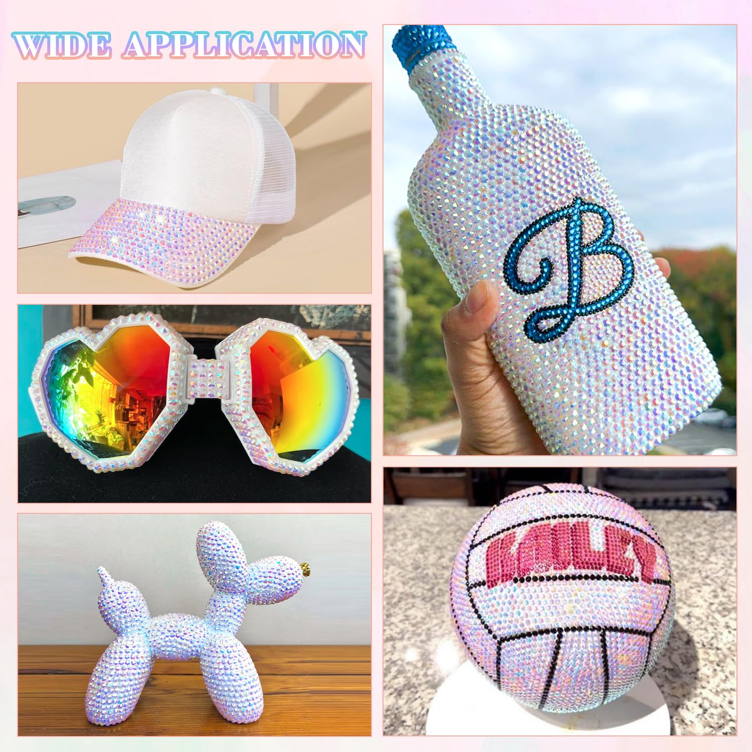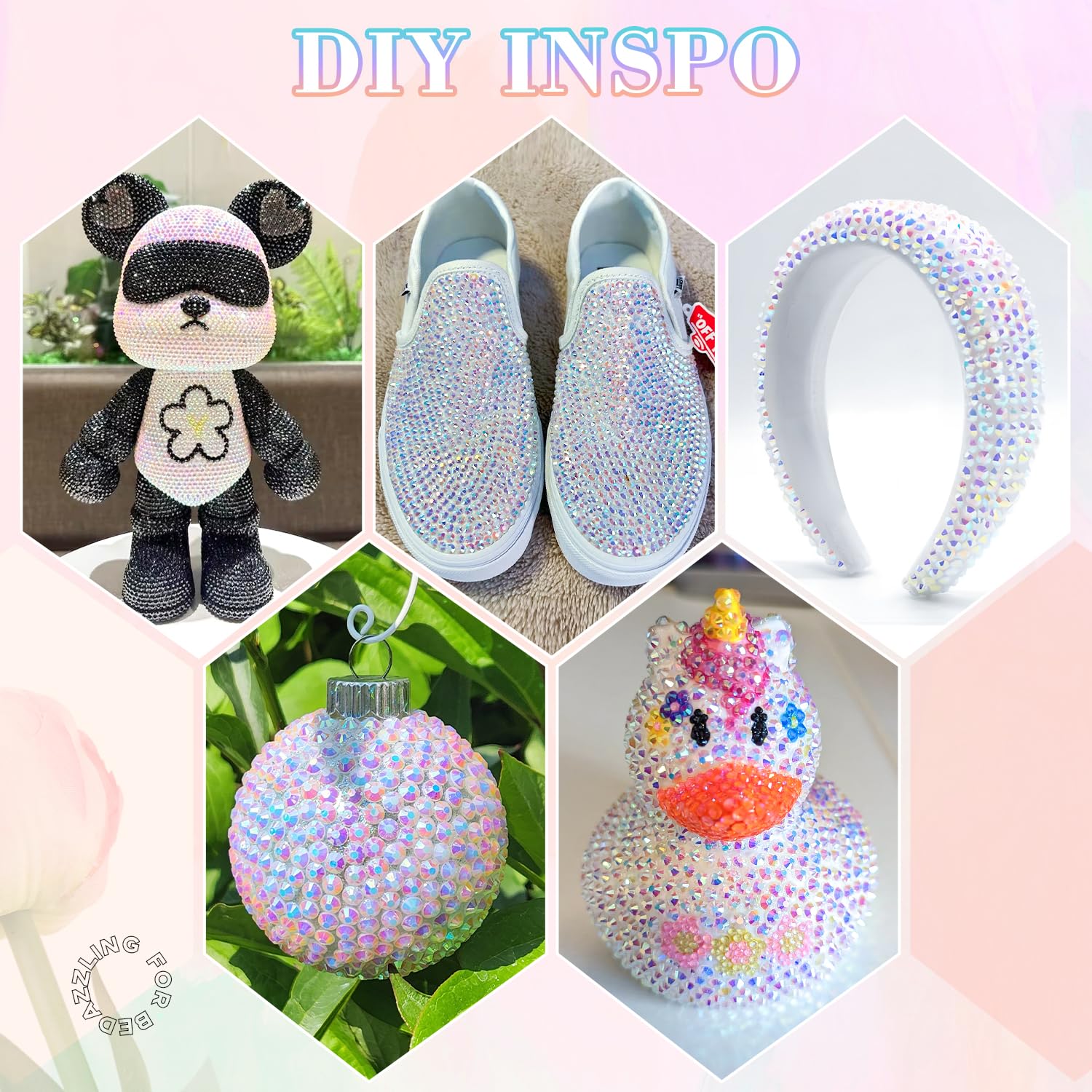 - PACKAGE CONTENT – This all-in-one bedazzler kit includes everything you need to start creating dazzling designs: 1 box of White AB rhinestones with 24 grids (approx. 30,000 pcs of bedazzling rhinestones assorted size SS6/10/16/20/30 ), 1 precision tweezers, 1 pickup pen for handling small gems, and 3 tubes of B7000 jewelry glue for secure application.