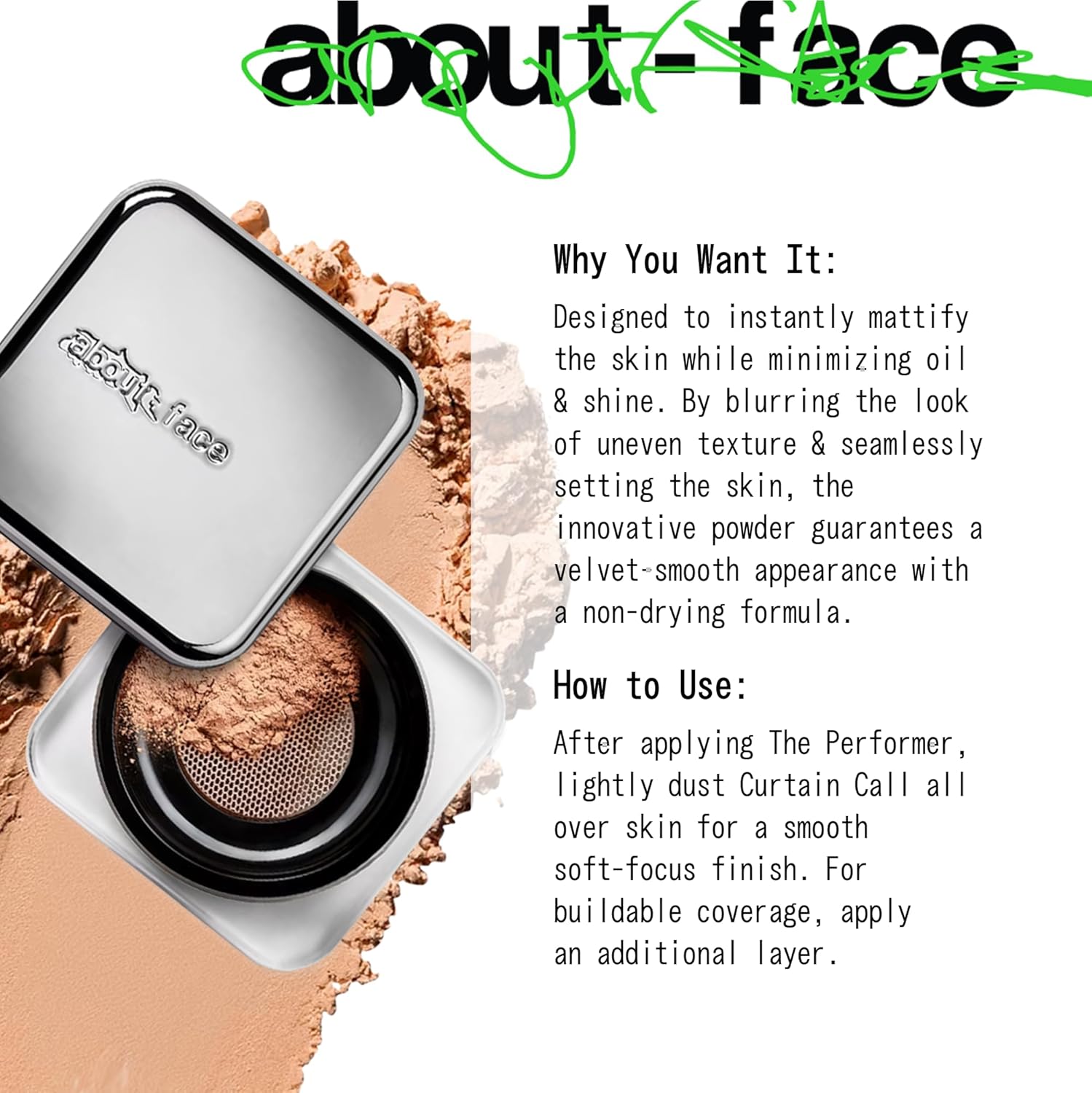 about-face Curtain Call Set & Smooth Loose Powder Draped – Lightweight, Oil-Absorbing Setting Powder with Rice Starch & Corn-Based Talc Alternative – Vegan, Cruelty-Free – 0.35oz (Medium)