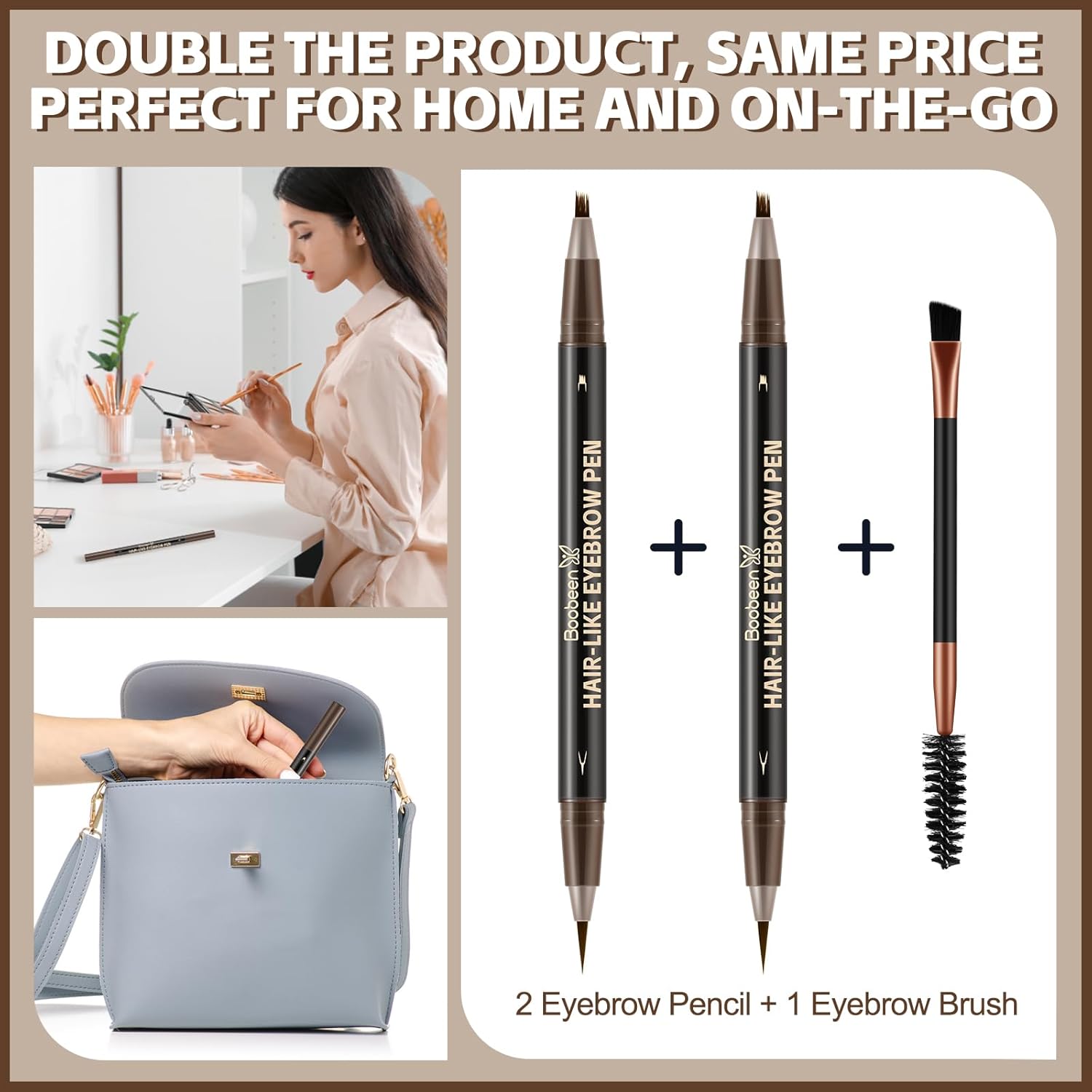 Boobeen 2pcs Waterproof Eyebrow Pen,Dual-Ended Eyeliner Microblading Eyebrow Pencil for Women,Long Lasting Hair-Like Brow Pen with Brow Brush,Dark Brown