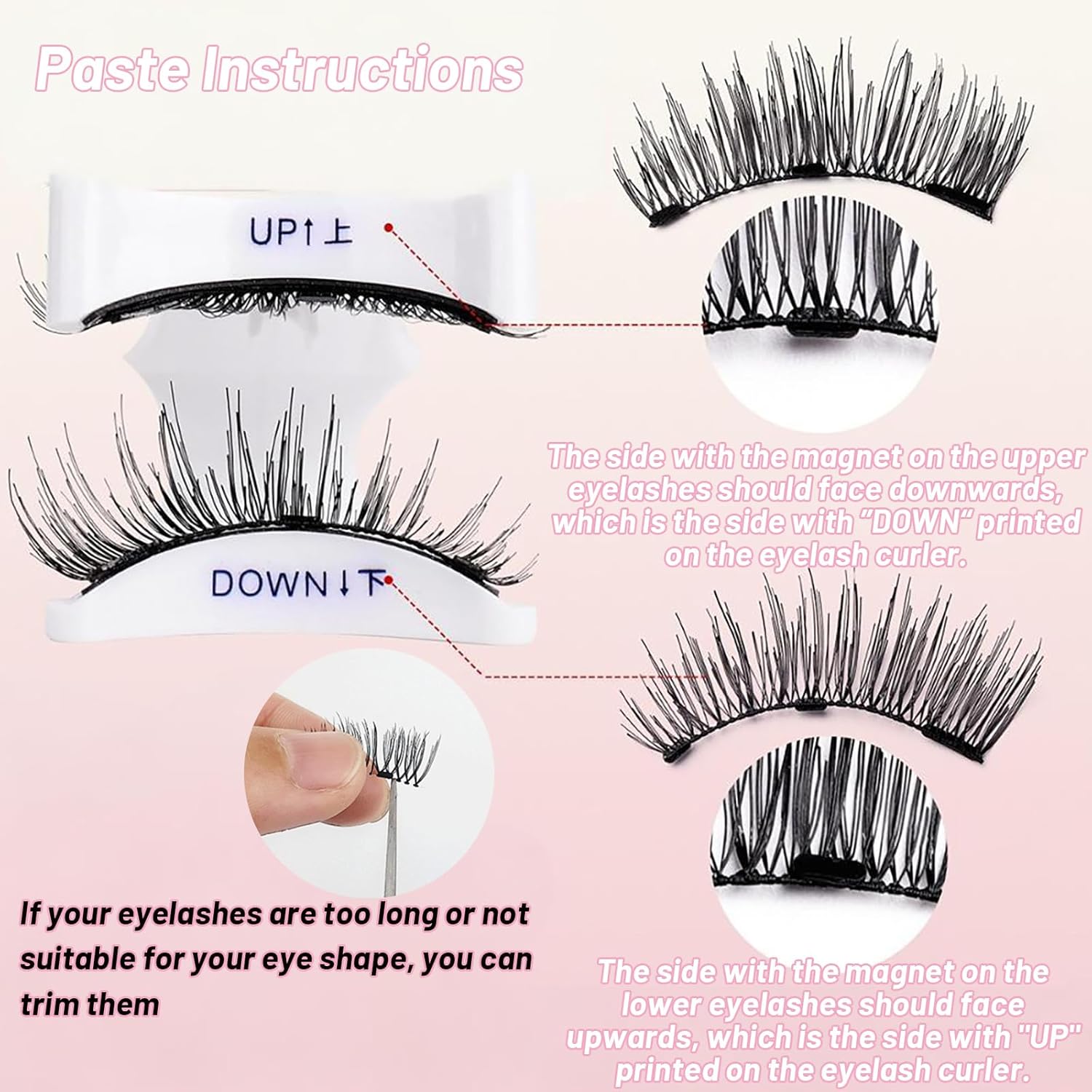 - 【3-Second Quick Application】Take one magnetic eyelash and gently twist the upper and lower lashes with your fingers to successfully separate the upper and lower magnetic lashes. Attach the upper magnetic lash to the "top" section of the eyelash curler and the lower lash to the "bottom" section. Align with your lash line and simply apply with a single curl